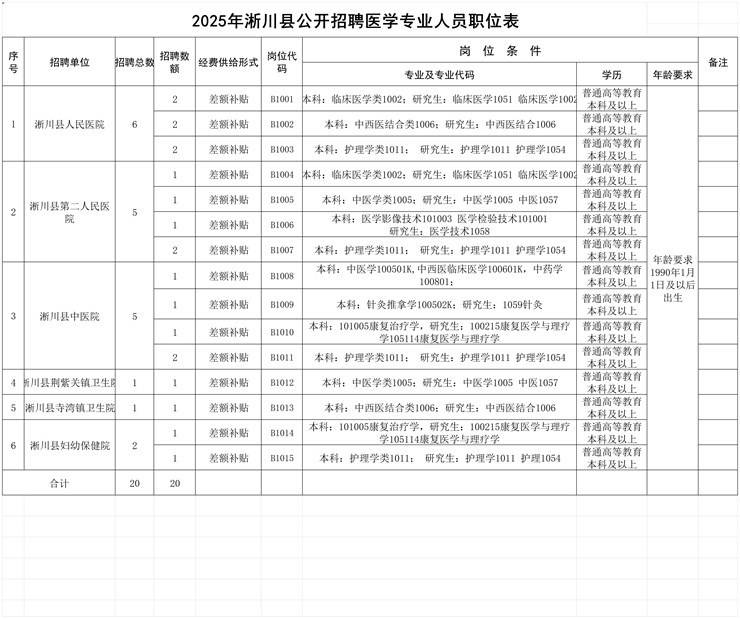 本次公开招聘医学专业人员20名(含2026届应届毕业生),特岗全科医生3名。具体岗位及条件详见职位表 (附件1、2)。