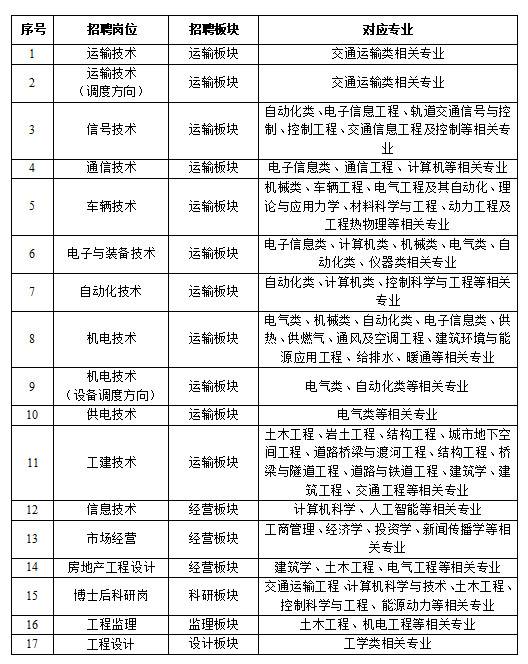 招聘板块包含运输板块、经营板块、科研板块、设计板块及监理板块等,具体岗位及对应专业详见下表。后续,还有更多岗位分批发布,请持续关注广州地铁官网或“下一站广州地铁”微信公众号招聘信息。